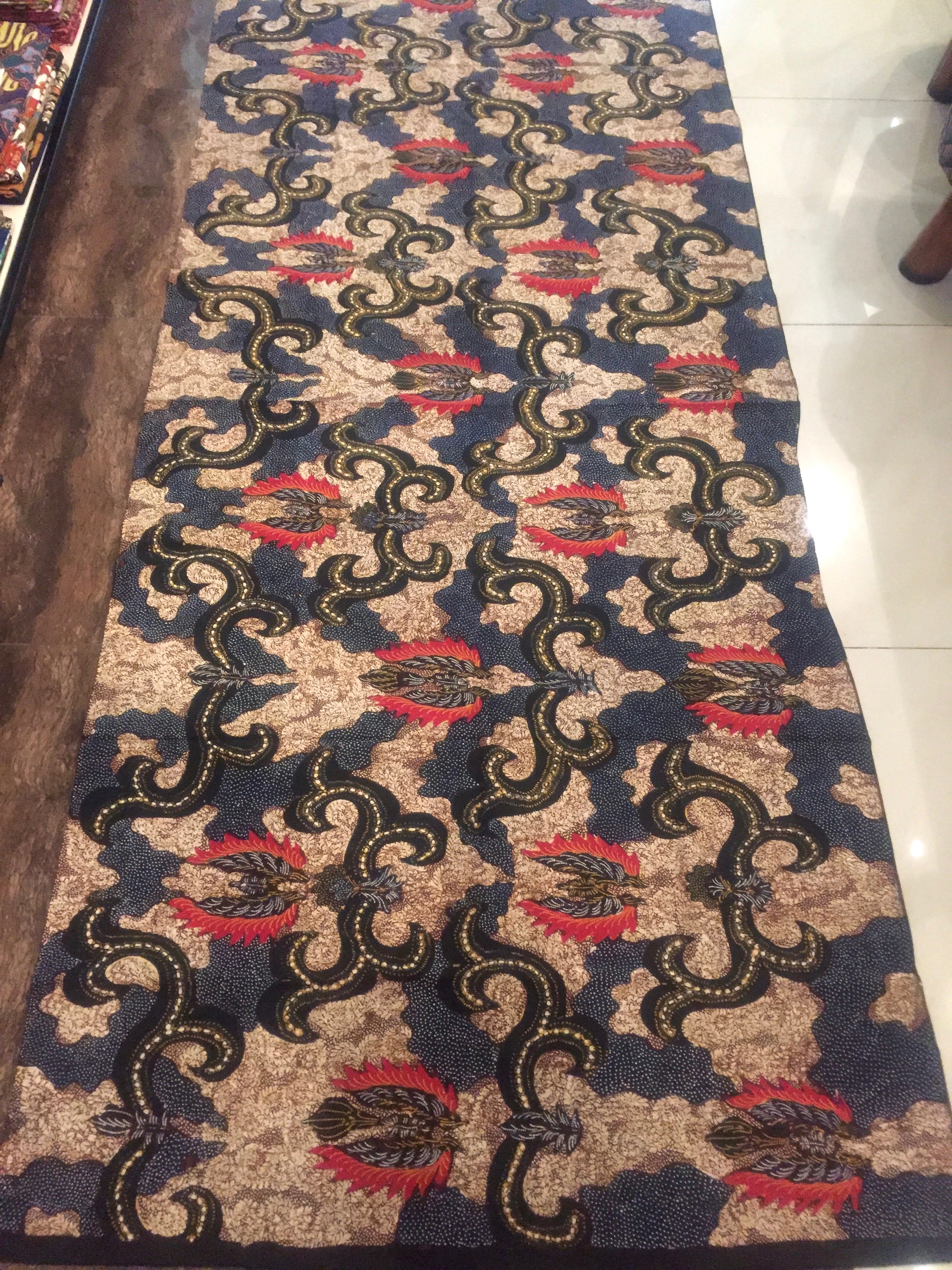Kain batik tulis Madura dengan motif kenari, warna asli kain coklat, putih tulang, kuning, merah, hitam, pola jarit