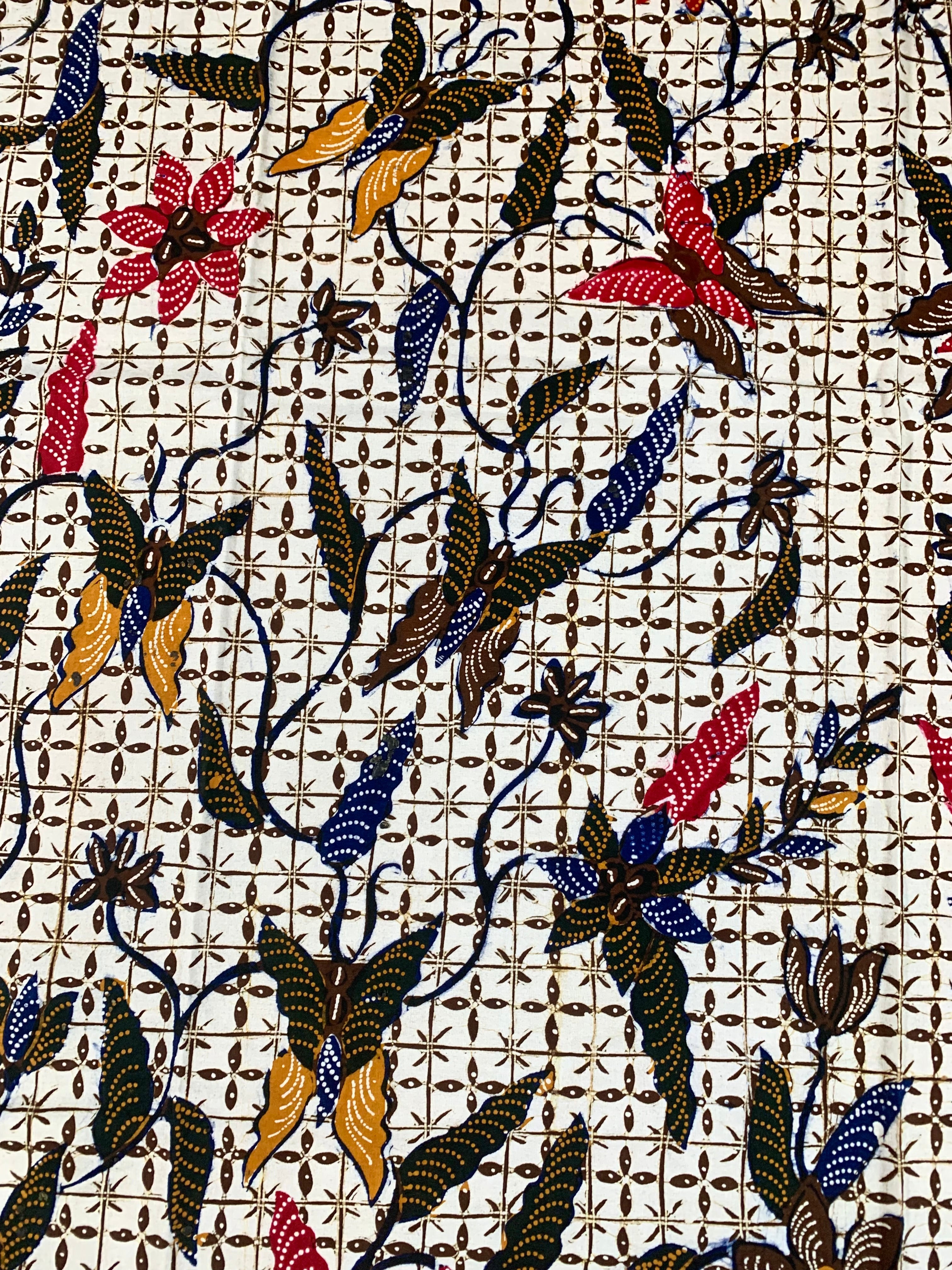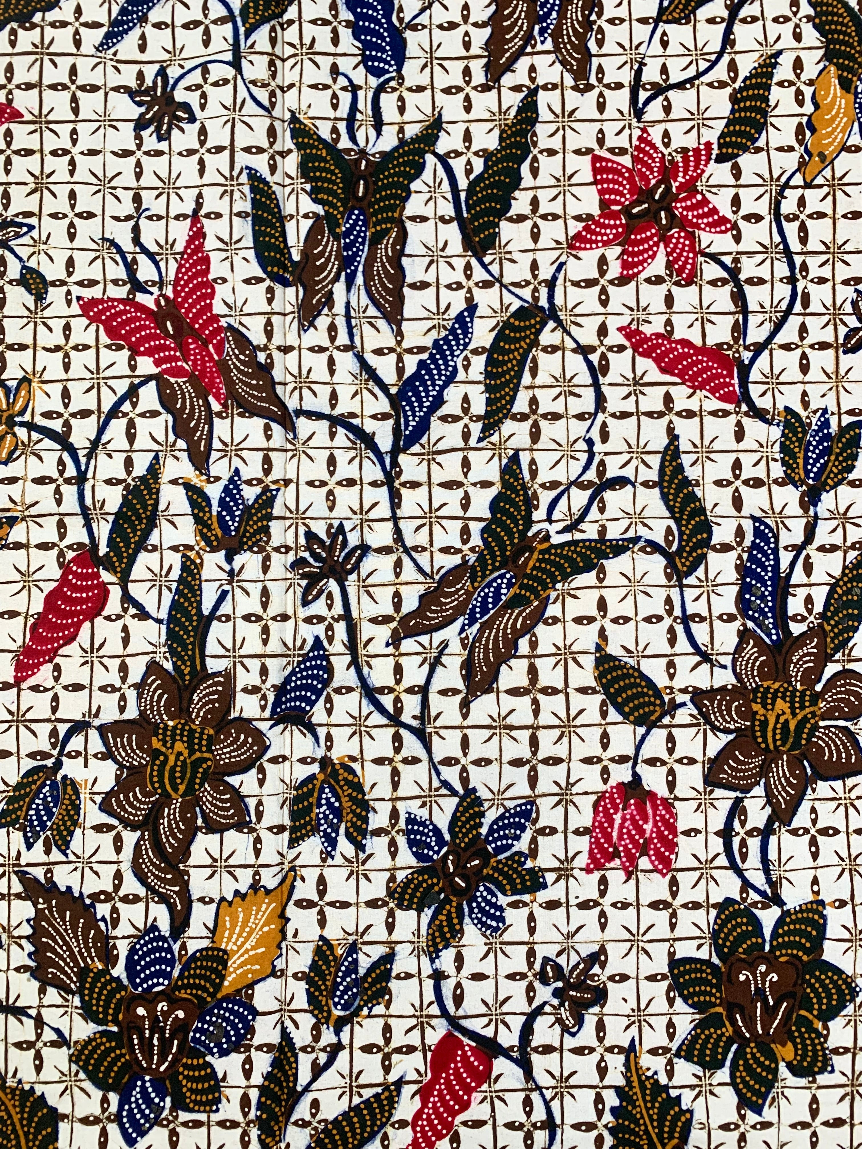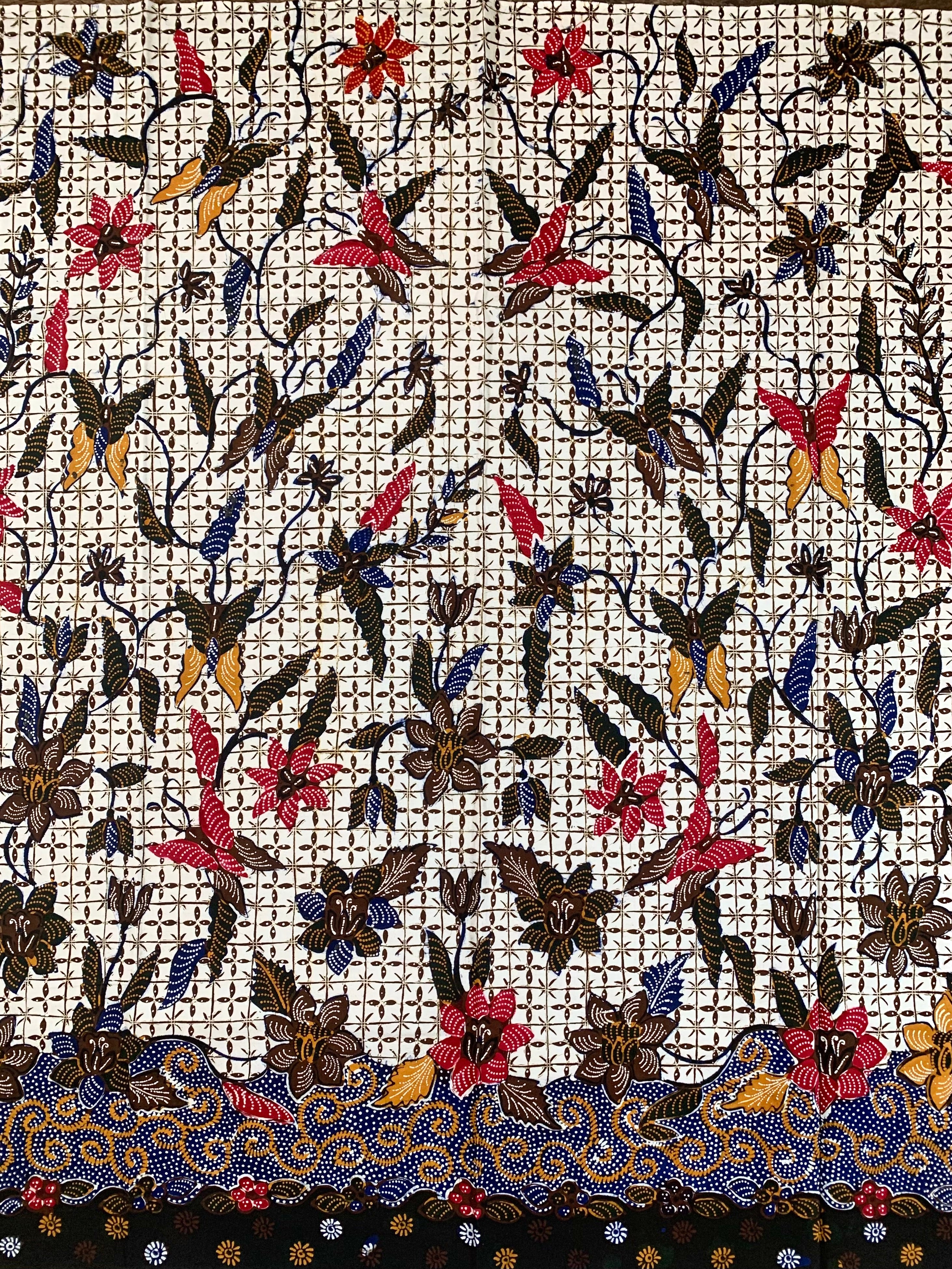 Kain batik tulis Pamekasan dengan motif boket bunga kawung, warna asli kain merah, biru dongker, hijau, coklat, hitam, putih, pola jarit