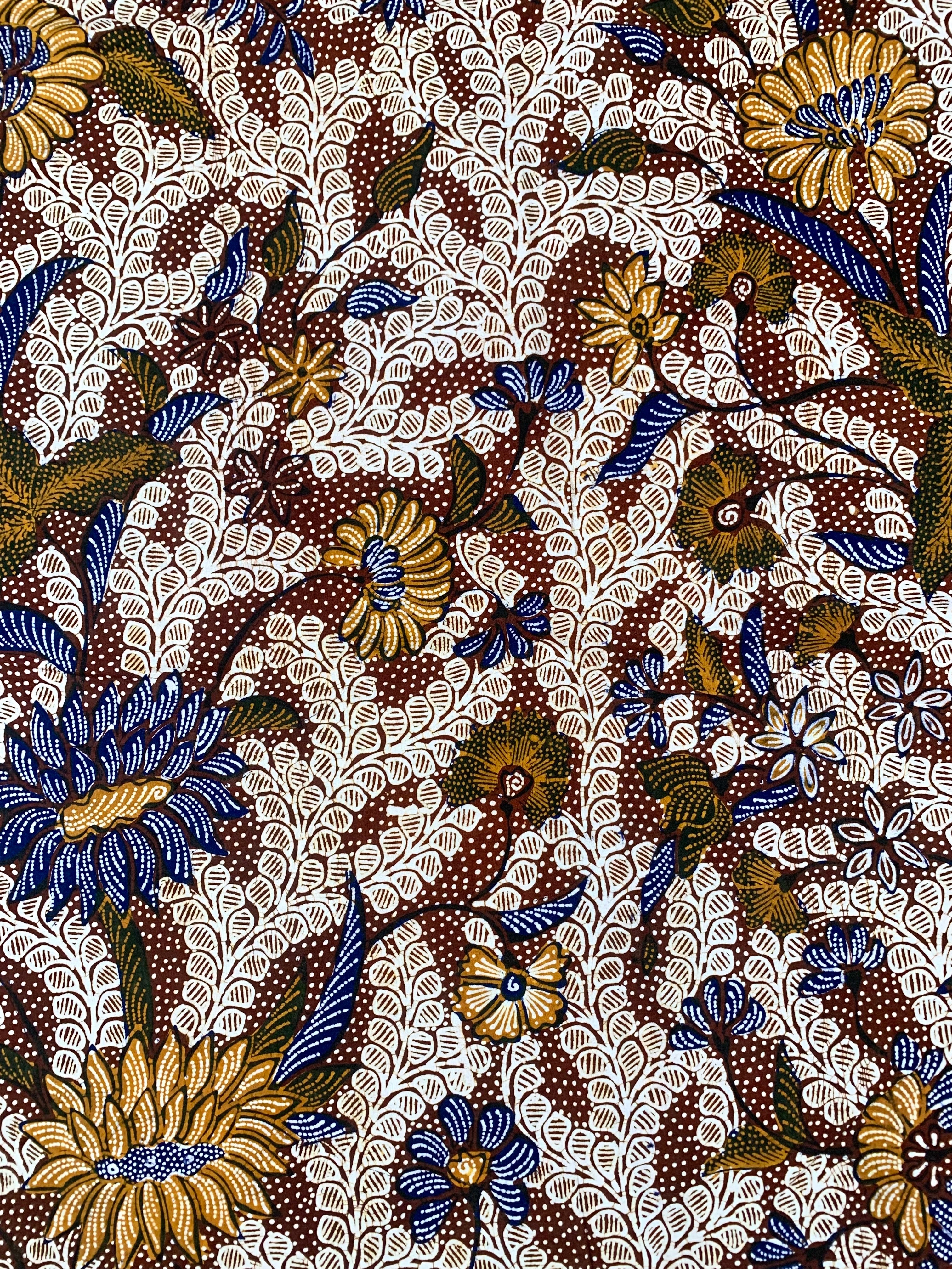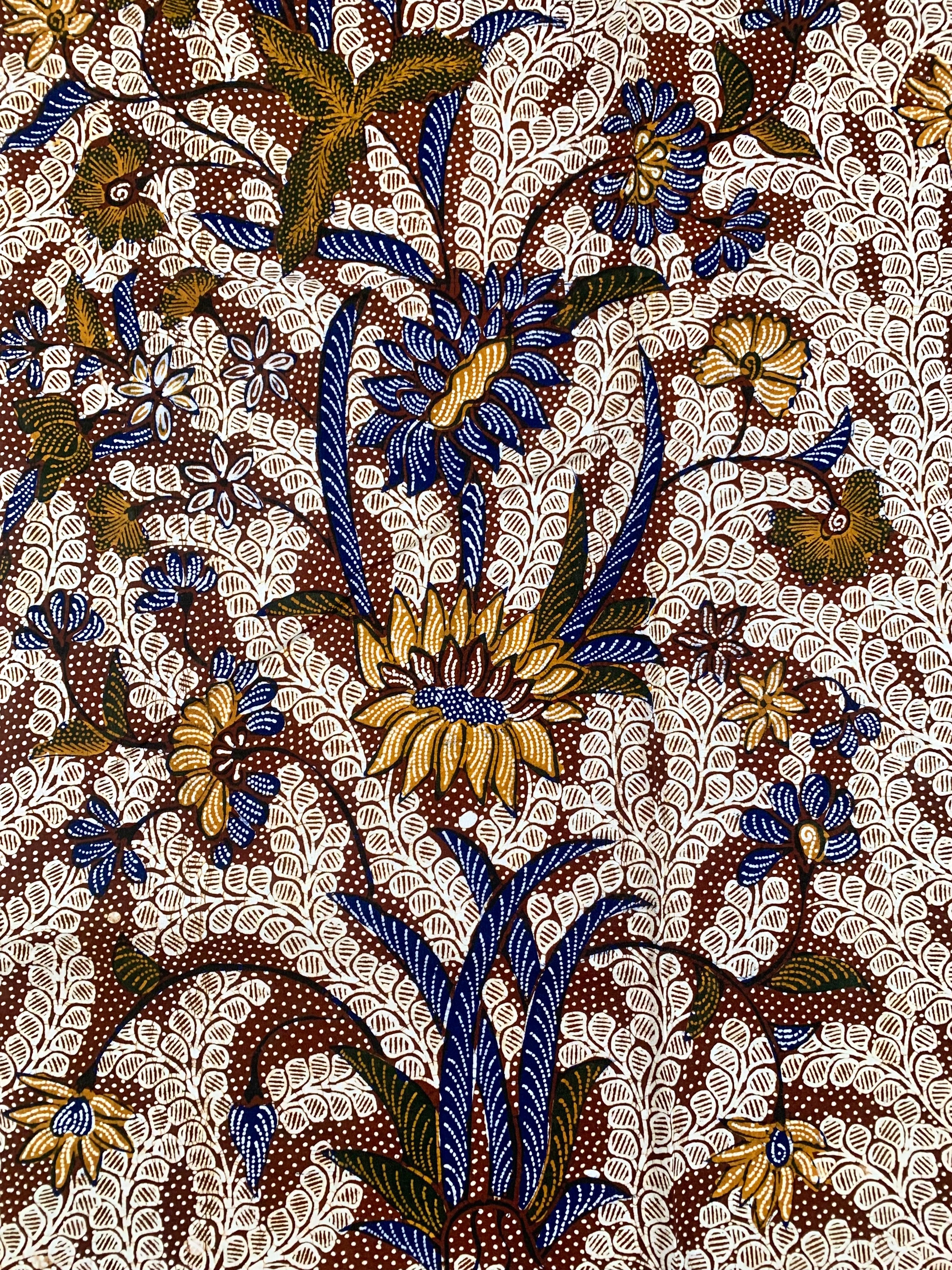 Kain batik tulis Pamekasan dengan motif boket kembang, warna asli kain biru dongker, coklat tua, coklat muda, hitam, putih, pola jarit