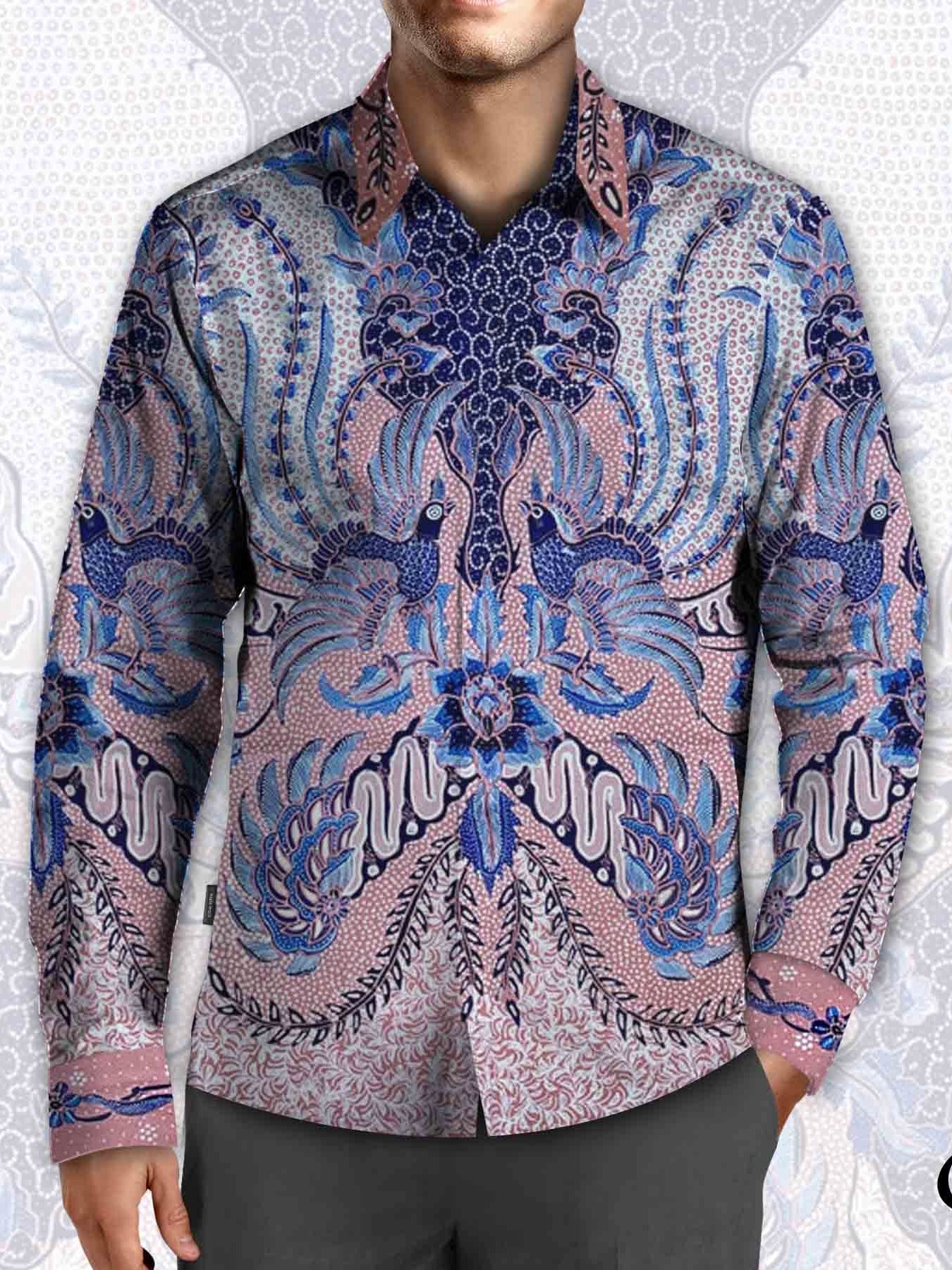 Kain batik tulis Pekalongan dengan motif burung tarung, warna asli kain cream, biru, coklat muda, hitam, putih, pola kemeja lengan panjang